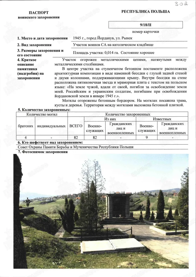 Страна захоронения Польша Регион захоронения Малопольское воев. Номер захоронения в ВМЦ З48-302 Место захоронения г. Йорданув, ул. Рынек Дата создания современного места захоронения __.__.1945 Дата последнего захоронения __.__.1945 Вид захоронения участок воинов СА на католическом кладбище Состояние захоронения хорошее Количество могил 4 Захоронено всего 82 Захоронено известных 9 Захоронено неизвестных 73 Кто шефствует над захоронением Совет Охраны Памяти Борьбы и Мученичества Республики Польши Откуда производились перезахоронения:г. Выстра; г. Йорданув; г. Спытковице; гм. Быстра-Сидзина (быв.), Велка Полана; гм. Токарня, Венчурка http://obd-memorial.ru/html/info.htm?id=86107565