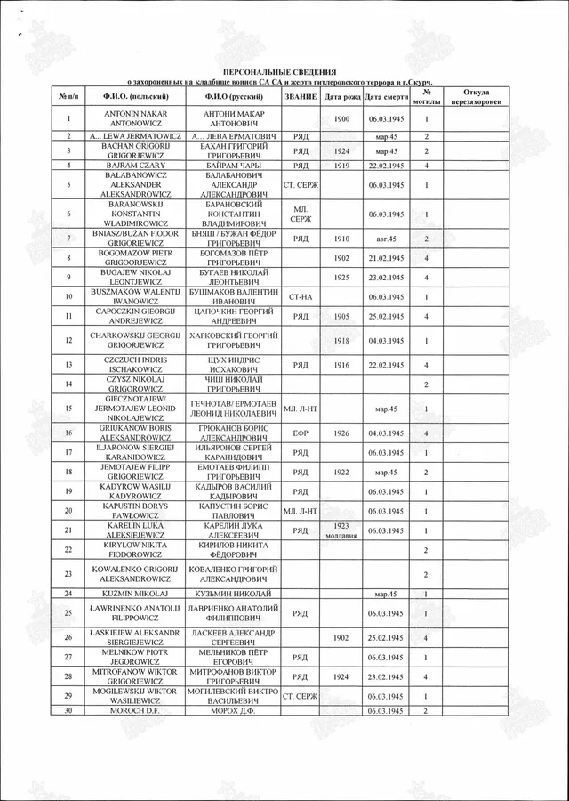 Страна захоронения Польша Регион захоронения Поморское воев. Номер захоронения в ВМЦ З48-517 Место захоронения г. Скурч Дата создания современного места захоронения __.__.1945 Дата последнего захоронения __.__.1945 Вид захоронения кладбище воинов СА и жертв гитлеровского террора Состояние захоронения хорошее Количество могил 8 Захоронено всего 282 Захоронено известных 65 Захоронено неизвестных 217 Кто шефствует над захоронением Совет Охраны Памяти Борьбы и Мученичества Республики Польши