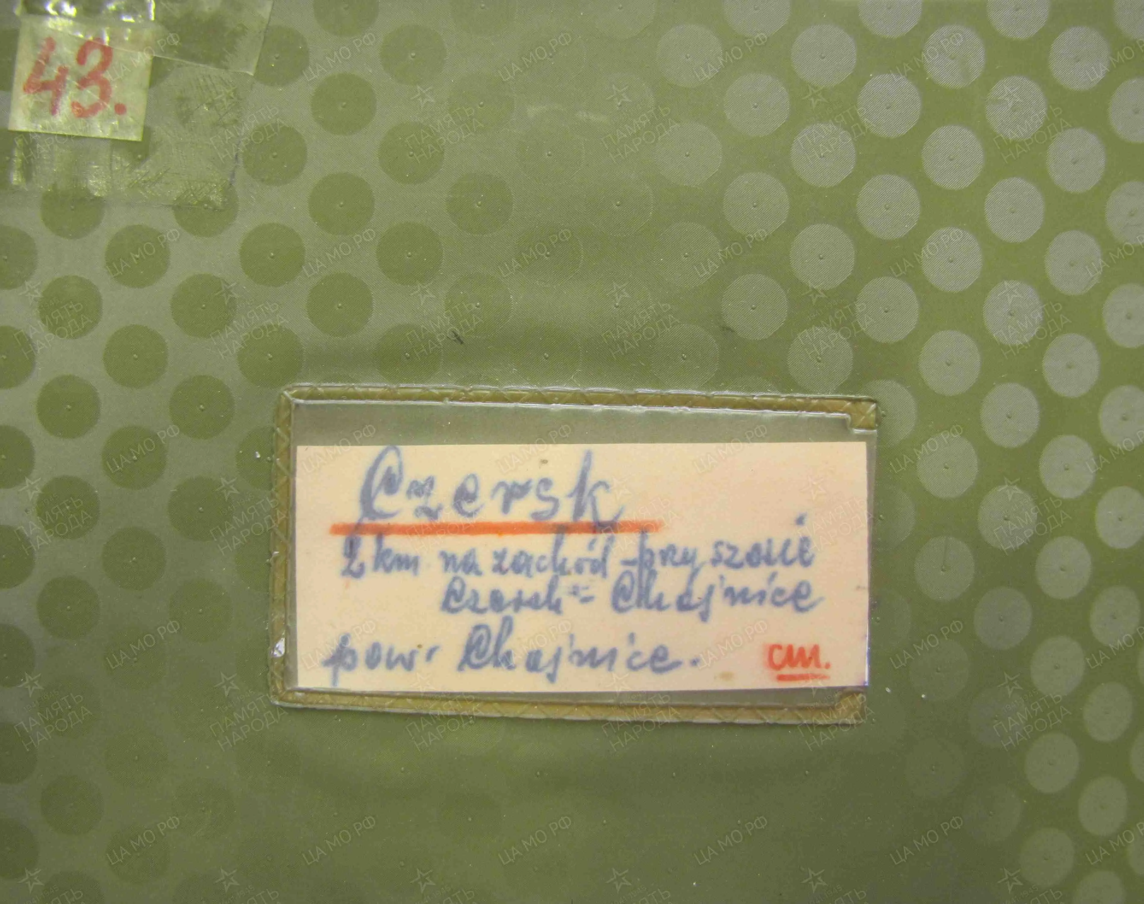 Информация о захоронении Страна захоронения Польша Регион захоронения Быдгощское воев. Номер захоронения в ВМЦ ЗПКК-043 Место захоронения повят Хойницкий, Черск, шоссе Черск-Хойнице, 2 км на запад Дата создания современного места захоронения __.__.1946 Дата последнего захоронения __.__.1950 Количество могил 24 Захоронено всего 1141 Дополнительная информация о месте захоронения информация могла устареть Откуда производились перезахоронения: гм. Черск, гр. Мокре; гм. Черск, гр. Бензимеровице; гм. Черск, гр. Шинвальд; гм. Черск, гр. Островите; гм. Черск, гр. Курче; гм. Черск, гр. Коневки; гм. Черск, гр. Малахин; гм. Черск, гр. Лубна; гм. Черск, гр. Класковы; гм. Черск, гр. Луково; гм. Черск, гр. Цис; гм. Черск, гр. Кшиж; гм. Черск, гр. Квеки; гм. Черск, гр. Гутовец; гм. Черск, гр. Лонг; гм. Карсин, г. Черск; гм. Рытел; гм. Черск, гр. Готелп