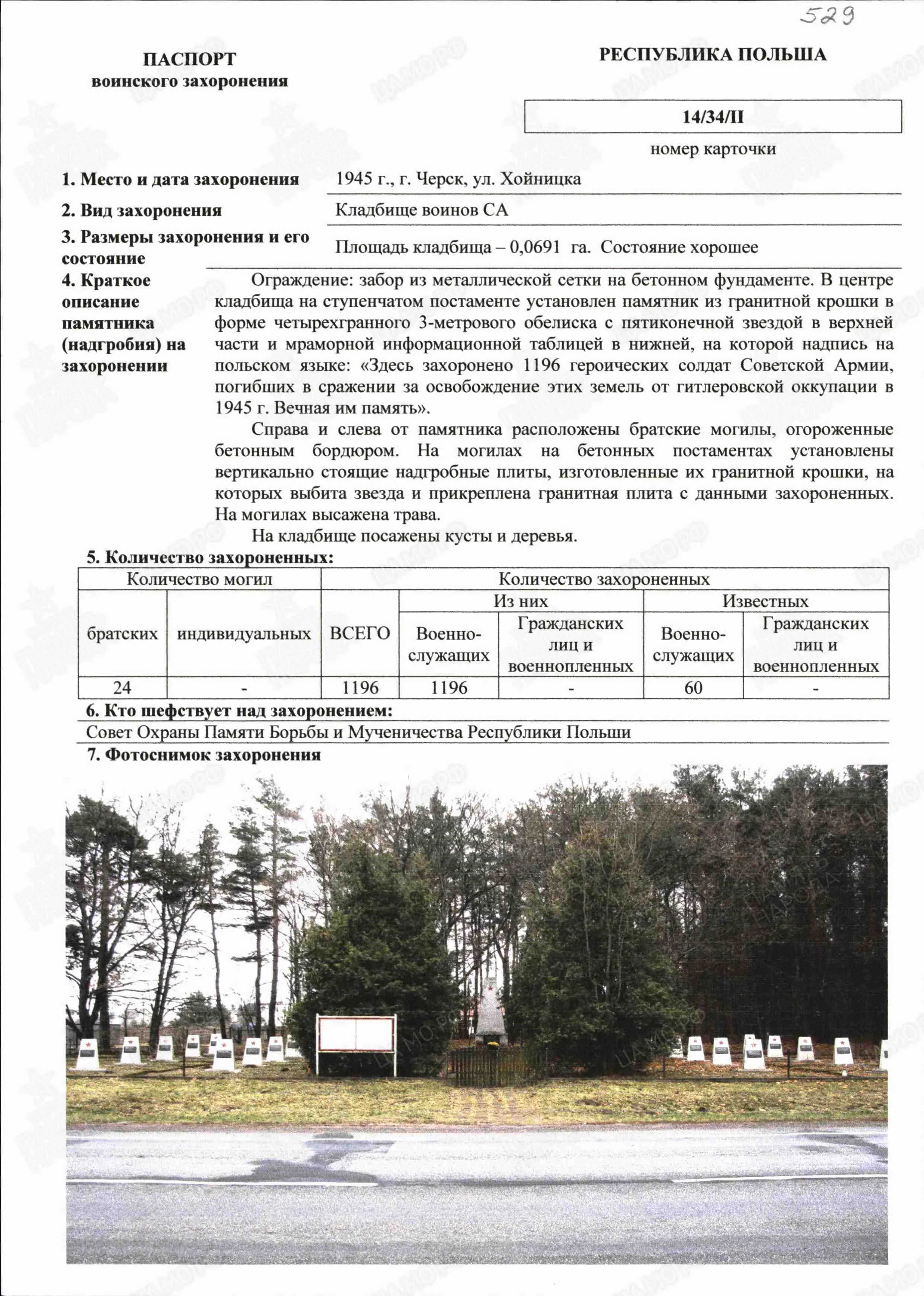| Информация о захоронении Страна захоронения Польша Регион захоронения Поморское воев. Номер захоронения в ВМЦ З48-529 Место захоронения г. Черск, ул. Хойницка Дата создания современного места захоронения __.__.1945 Дата последнего захоронения __.__.1945 Вид захоронения кладбище воинов СА Состояние захоронения хорошее Количество могил 24 Захоронено всего 1196 Захоронено известных 60 Захоронено неизвестных 1136 Кто шефствует над захоронением Совет Охраны Памяти Борьбы и Мученичества Республики Польши http://www.obd-memorial.ru/html/info.htm?id=86396855