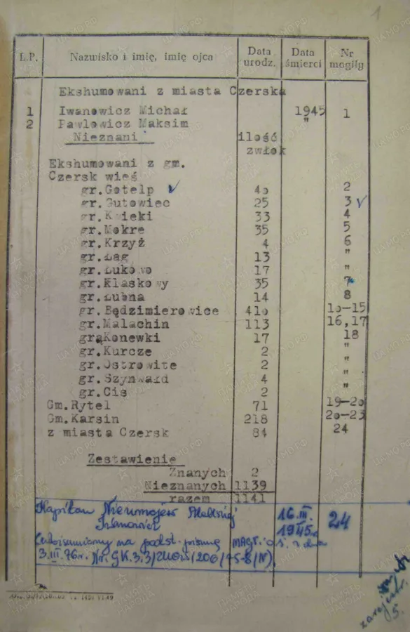 | Информация из списков захоронения Фамилия [17 неизвестных] Имя Отчество Страна захоронения Польша Регион захоронения Быдгощское воев. Место захоронения повят Хойницкий, Черск, шоссе Черск-Хойнице, 2 км на запад Могила 6 Откуда перезахоронен гм. Черск, гр. Луково https://www.obd-memorial.ru/html/info.htm?id=85981101