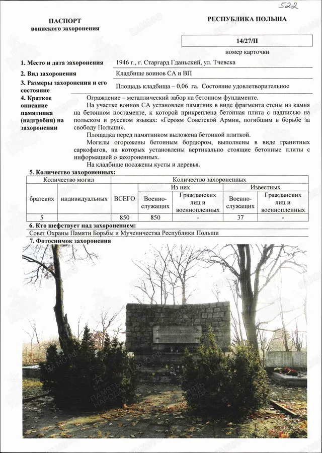 Согласно данных ПКК из Осек переносили на мемориал в Старогард: