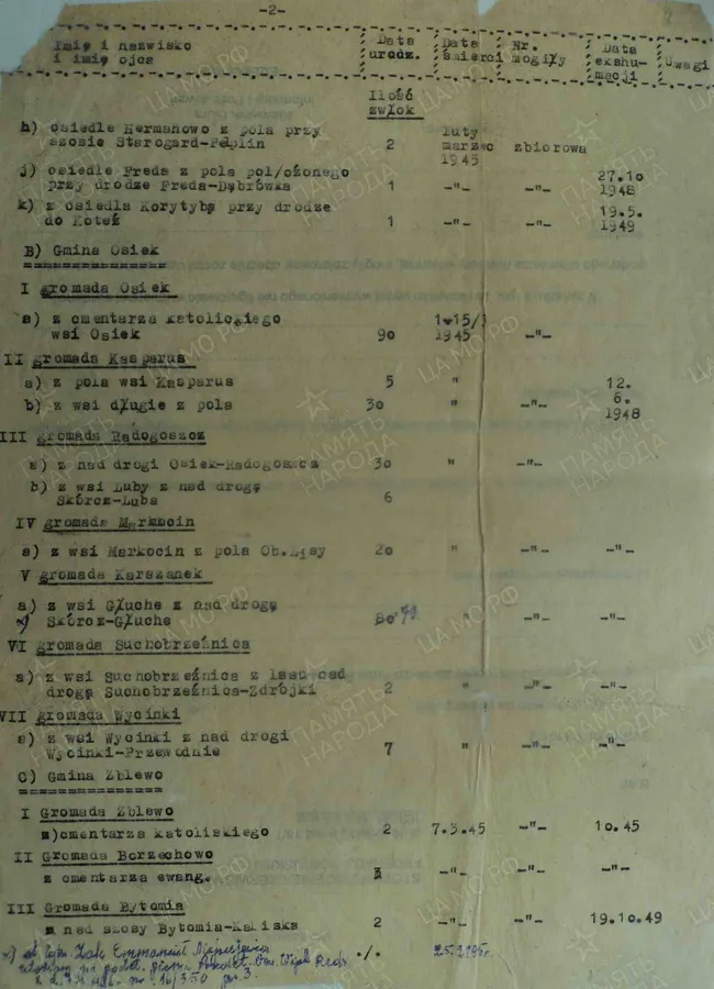 Откуда производились перезахоронения г. Старгард, ул. Костюшки, ул. Поморская, ул. Любиховская, ул. Дворцовая; гм. Осек, гр. Осек, гр. Каспарус, гр. Радогощ, гр. Маркоцин, гр. Каршанек, гр. Выцинки; гм. Зблево, гр. Зблево, гр. Божехово, гр. Бытомя, гр. Пинчин; гм. Осечна, гр. Бжежно, гр. Кланины, гр. Крувно, гр. Линувек, гр. Осечна, гр. Осувек, гр. Шляхта, гр. Зимне-Здрое; гм. Калиска, гр. Лубики, гр. Калиска; гм. Старогард-Веш, гр. Котеже, гр. Линувец, гр. Рывальд, гр. Тшцинск, гр. Жабно; гм. Бобово, гр. Бобово, гр. Домбрувка, гр. Грабово, гр. Грабовец, гр. Высока