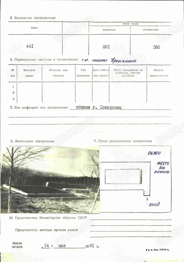 Информация о захоронении Страна захоронения Югославия Номер захоронения в ВМЦ З381-7 Место захоронения г. Пожаревац Дата создания современного места захоронения __.__.1944 Дата последнего захоронения __.__.1962 Вид захоронения братская могила Количество могил 1 Захоронено всего 441 Захоронено известных 261 Захоронено неизвестных 180 Кто шефствует над захоронением община г. Пожаревац http://www.obd-memorial.ru/html/info.htm?id=262068471