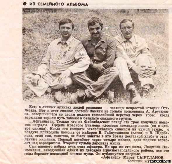 17 августа 1980 г. катастрофа вертолета Ми-24Д 181-го овп (Кундуз). Облет авиатехники после ремонта в зоне а/э Кундуз. Вертолет командира аэ м-ра Козового М.Р., сразу после взлета, по не выясненой причине потерял управление и столкнулся с землей. Экипаж в составе командира вертолета, борттехника ст. л-та Краснухина К.Г. и занявшего место оператора - зам. по летной подготовке 181-го полка, Героя Советского Союза м-ра Гайнутдинова В.К. погиб. Нашел газетную вырезку со статьей о нашем Герое: Однако в др.источниках пишут,что по вертолету был произведен выстрел то ли из РПГ,то ли из Стингенра. Только что-то у меня не открывается прикрепленное изображение.Что-то сделал не так?