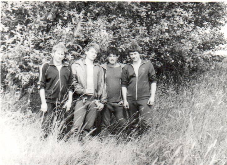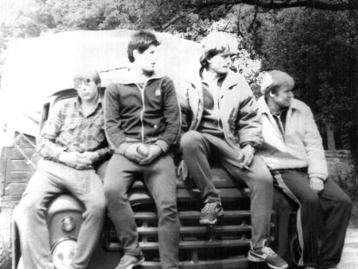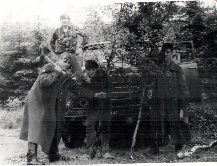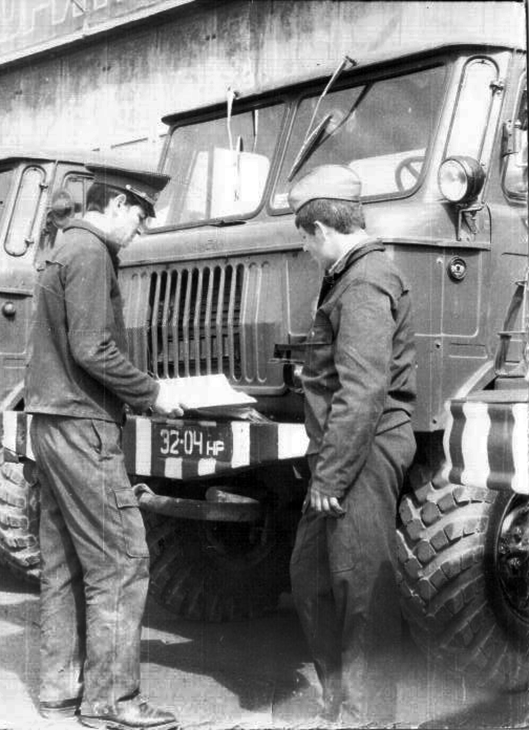 Здесь справа налево:Игорь Заяц,потом прапорщика забыл фамилию,нач.автослужбы ст.л-т Краснобаев,ком.автовзвода ст.пр-к Воробьёв. Очень хорошо видно столовку. Мой командир взвода старший прапорщик Воробьёв. Позади стоит продуктовый ЗИЛ130. На нём я ездил почти год. Серёга Олава-Легница 89-91