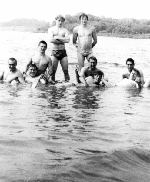 Там где с топором по моему: Палагута, С. Пидорченко, И. Атаманчук и П. Хаджилий. Ниже С Бахолдин ?, И Атаманчук, С. Ковпак. На фото где купаются знаю не всех, да и качество снимка похуже. Где снимались? Я что то не помню речки.