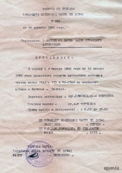 В 81-й ГОДУ, МАЙОР КИСЬ ИСПОЛНЯЛ ОБЯЗАННОСТИ НАЧАЛЬНИКА АВТОСЛУЖБЫ. ОН ЖЕ ОТВЕЧАЛ ЗА БОКСЫ НЗ С АВТОТЕХНИКОЙ. ОН МЕНЯ ДРАЛ ЗА СПИСАНИЕ 300 ЛИТРОВ А-93 ЗА ДВЕ НЕДЕЛИ НА МОТОЧАСЫ, НА ПРОГРЕВ ДВИГАТЕЛЯ... ) ПОСЛЕ КОМАНДИРОВКИ НА "ОКАЛИНУ". НА ПОЛКОВОМ СОБРАНИИ. В СОЛДАТСКОМ КЛУБЕ. ) ЕЩЁ ДО КОМАНДИРОВКИ ПО ЭТОЙ ВЫПИСКИ, КОТОРУЮ Я ВЫЛОЖИЛ. ... И МАЗ Я ПЕРЕГОНЯЛ С НЗ В АХО ПО ЕГО ПРИКАЗУ И С НИМ ЗА СТАРШЕГО МАШИНЫ. )