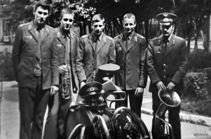Я начал играть в оркестре с самого образования его.Проходив службу в учебной роте к нам как-то пришел сержант сверх срочник с красными погонами с петлицами арфы ,С МУЗ роты гарнизонного оркестра,и спросил кто умеет играть на духовых инструментах.Ну я и вышел из строя.Он нас переписал ,а через месяц мы начали заниматься.А еще через месяц начали полноценно исполнять Встречный марш,В путь,Прощание славянки и еще несколько произведений. Позже этот сержант уходит и на место его пришел старшина Правдивый и до конца моего дембеля он руководил оркестром. Частенько выезжали на встречи больших чинов на аэродромах. Были на вертолетке встречали дорогих гостей из Москвы с проверкой. В общем покатались по Польше. На маленьком барабане стучал Чиковани на большом Почтальон фамилию забыл.СлаваКоровин играл на баритоне ,Мудров и Глянцев на алте а Я играл на самой большой трубе называется Бас-Туба. Все было интересно и здорово когда полк имел свой Духовой оркестр. Жалко что фотографий с оркестром очень мало.