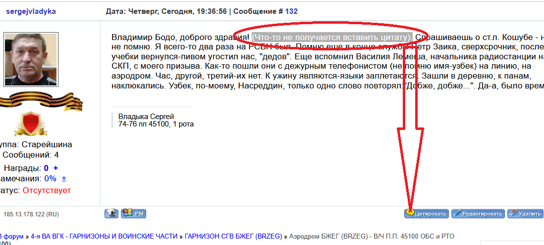 Владимир Бодо, доброго здравия! (Что-то не получается вставить цитату). Спрашиваешь о ст.л. Кошубе - нет, не помню. Я всего-то два раза на РСБН был. Помню еще в конце службы Петр Заика, сверхсрочник, после учебки вернулся-пивом угостил нас, "дедов". Еще вспомнил Василия Лемеша, начальника радиостанции на СКП, с моего призыва. Как-то пошли они с дежурным телефонистом (не помню имя-узбек) на линию, на аэродром. Час, другой, третий-их нет. К ужину являются-языки заплетаются. Зашли в деревню, к панам, наклюкались. Узбек, по-моему, Насреддин, только одно слово повторял:"Добже, добже...". Да-а, было время! Владыка Сергей 74-76 пп 45100, 1 рота