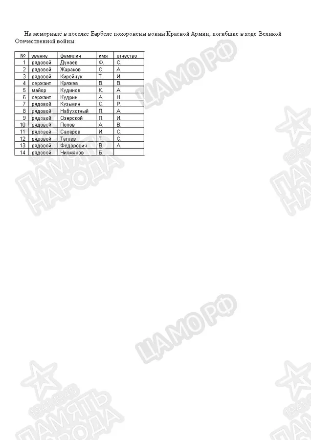 | Авиации СГВ МЕМОРИАЛЫ И ЗАХОРОНЕНИЯ СОВЕТСКИХ ВОИНОВ ВОИНСКИЕ ЗАХОРОНЕНИЯ В ЛАТВИИ Бауский край (Земгале), Латвия Мемориал Барбеле (латыш. Bārbele) (Административный центр Барбельской волости.) |