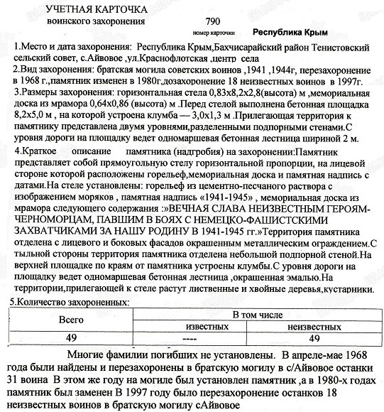 Страна захоронения Россия Регион захоронения Республика Крым Номер захоронения в ВМЦ 82-182 Место захоронения Бахчисарайский р-н, Тенистовский с/с, с. Айвовое, ул. Краснофлотская, центр села Дата создания современного места захоронения __.__.1941 Дата последнего захоронения __.__.1997 Вид захоронения братская могила советских воинов Количество могил 1 Захоронено всего 49 Захоронено известных 0 Захоронено неизвестных 49 Кто шефствует над захоронением Исполком Тенистовского с/совета с. Тенистое, ул. Заречная, 23, Бахчисарайский р-н, Республика Крым https://obd-memorial.ru/html/info.htm?id=33122303&p=1 Николай Викторович 14 ОА ПВО 1974-1976 У России только два союзника - это Армия и Флот