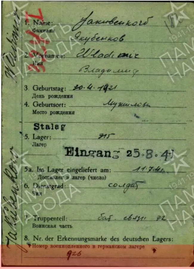 Запись в Книге Памяти, вероятнее всего, была сделана на основании хранящейся в архиве Зелëной (транзитной) карты пленного, где записана дата прибытия в шталаг 315 - 25.08.1941.
