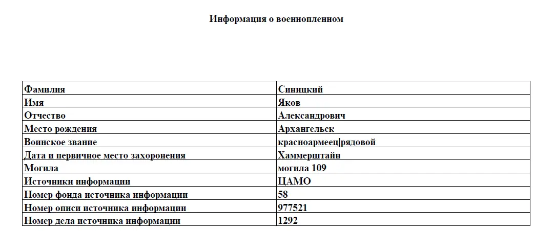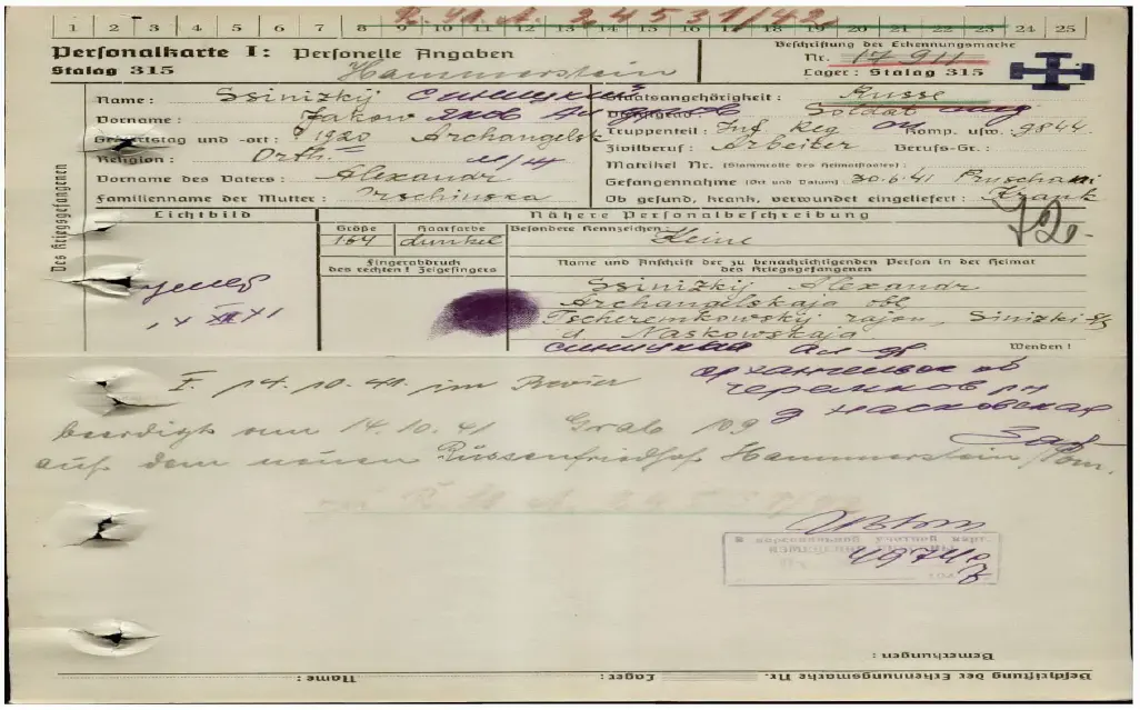 Здравствуйте! Помогите пожалуйста узнать больше о судьбе брата моего деда, всегда думали что он пропал без вести. И тут я выяснила что оказывается он умер в плену к концлагере Шталаг 315. Узнать бы его путь, как он попал в плен (с какого сражения или части), от чего умер... Синицкий Яков Александрович, 1920 г.рожд., пропал без вести в 1941 г. Помогите пожалуйста перевести карточку военнопленного, и может еще как то можно можно узнать подробнее о нем?