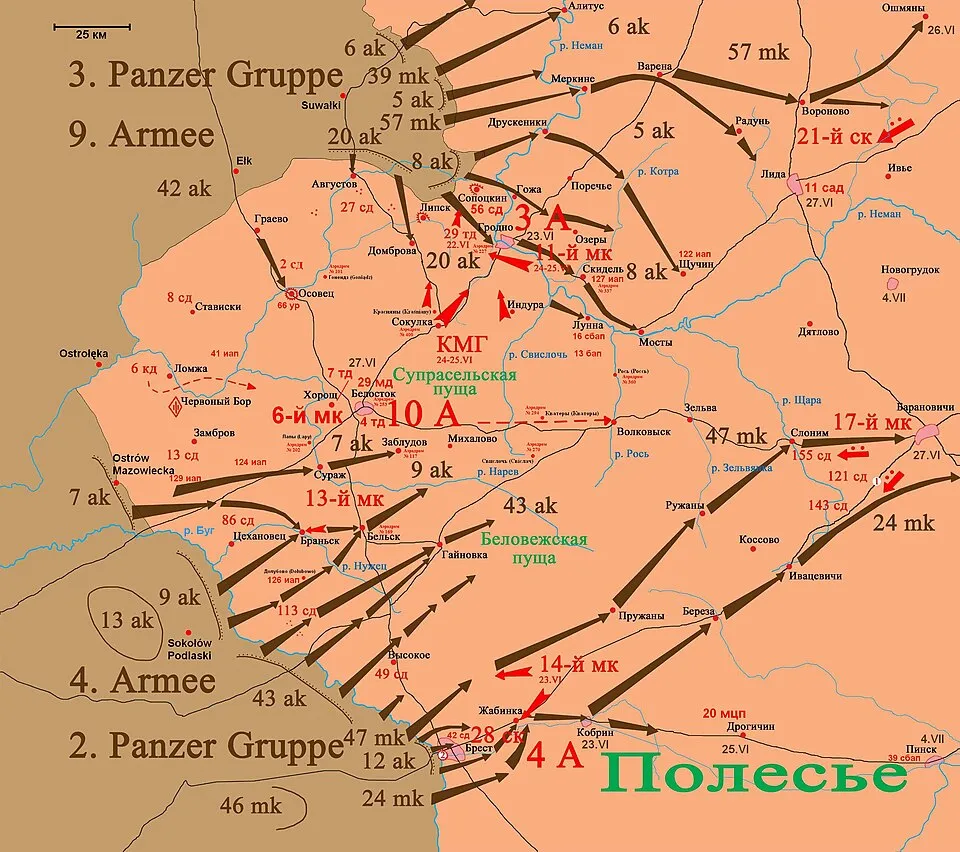 13-й механизированный корпус, потерявший в тяжелых боях все свои танки, с небольшим количеством бронемашин вел сдерживающие бои. Части корпуса оказались разобщены, они не имели связи с командованием, находясь в полуокружении. 31-я танковая дивизия вела бой у местечка Лапы, 208-я моторизованная небольшими очагами сопротивления сражается на рубеже рек Нурец, Нарев. Разрозненные части 25-й дивизии начали отход на Волковыск.