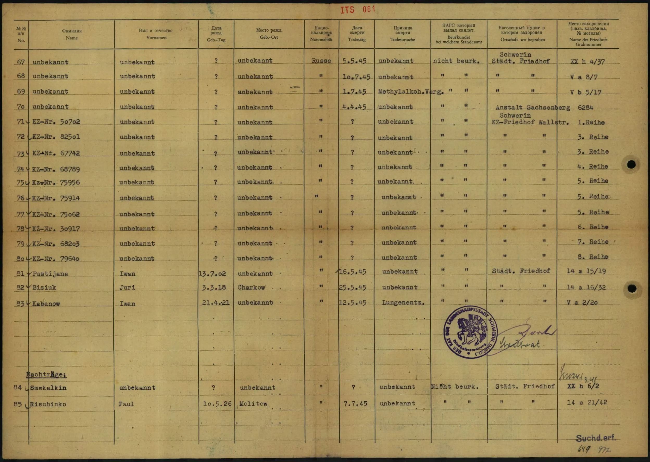 Рапорт № 75/61 от 15.2.1961 об обнаружении забытых массовых захоронений советских военнопленных поблизости от Шверина, на территории лесничеств Neu Zippendorf https://de.wikipedia.org/wiki/Neu_Zippendorf и Haselholz (https://mapcarta.com/de/18165280 а точнее, поблизости от Schwerin на соединительной дороге между улицей Hauptverkehrsstraße Schwerin-Crivitz и местечком Schwerin-Neu Zippendorf
