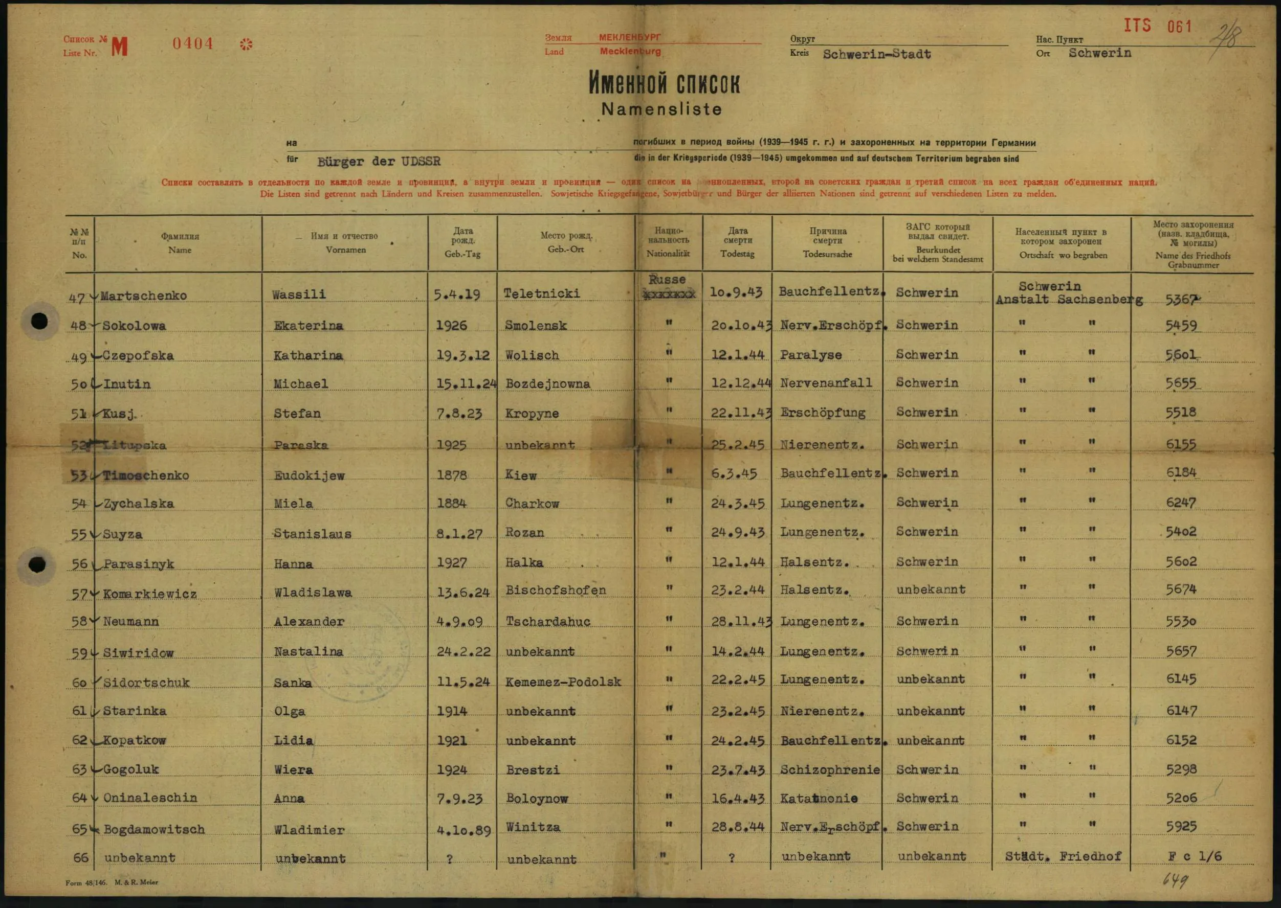 Списки советских граждан (возможно среди них есть военнопленные, требуется проверка), умерших и похороненных на кладбище при неврологической лечебнице Заксенберг (о кладбище при лечебнице см. выше) https://collections.arolsen-archives.org/de/document/70994025