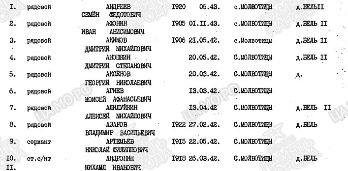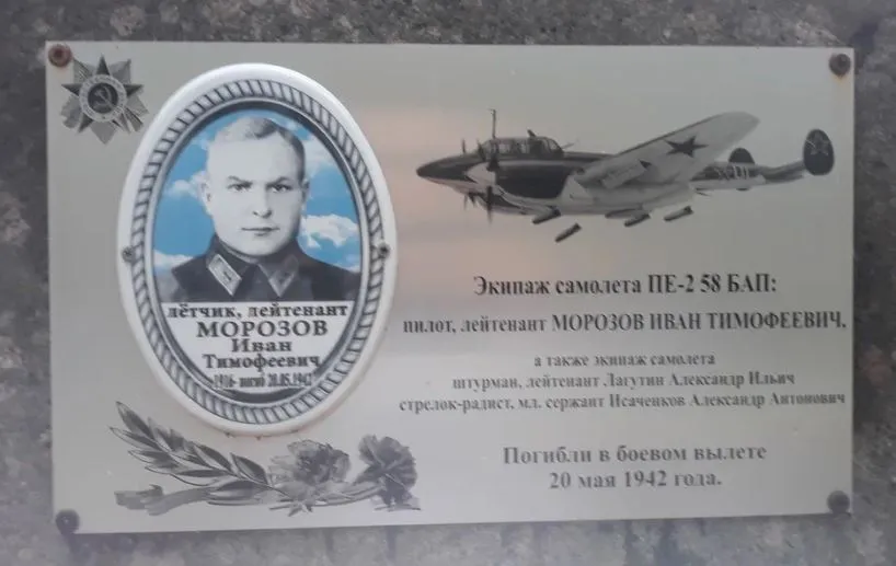 Фамилия Морозов Имя Иван Отчество Тимофеевич Дата рождения/Возраст 17.11.1916 Место рождения Белорусская ССР, Могилевская обл., Белыничский р-н, Прихабский с/с, д. Барсуки Последнее место службы 58 бап Воинское звание лейтенант Причина выбытия пропал без вести Дата выбытия 20.05.1942 Место выбытия Ленинградская обл., Демянский р-н, д. Черная, в районе Название источника донесения ЦАМО Номер фонда источника информации 35 Номер описи источника информации 11304 Номер дела источника информации 188 https://obd-memorial.ru/html/info.htm?id=1168399249