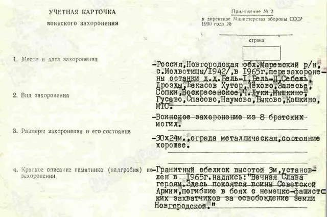 № 1 Фамилия Белов Имя Иван Отчество Иванович Дата рождения/Возраст __.__.1922 Последнее место службы 117 сп 23 сд Воинское звание лейтенант Дата смерти 20.05.1942 Страна захоронения Россия Регион захоронения Новгородская обл. Место захоронения Маревский р-н, д. Бель-2 https://obd-memorial.ru/html/info.htm?id=1154049462