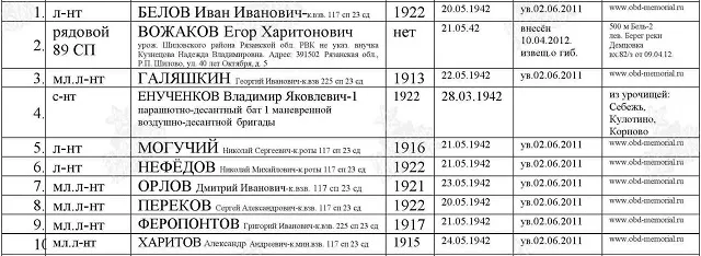 № 2 Фамилия Вожаков Имя Егор Отчество Харитонович Последнее место службы 89 сп Воинское звание рядовой Дата смерти 21.05.1942 Страна захоронения Россия Регион захоронения Новгородская обл. Место захоронения Маревский р-н, д. Бель-2 Откуда перезахоронен д. Бель-2, 500 м, р. Дымцовка, левый берег https://obd-memorial.ru/html/info.htm?id=1154049463