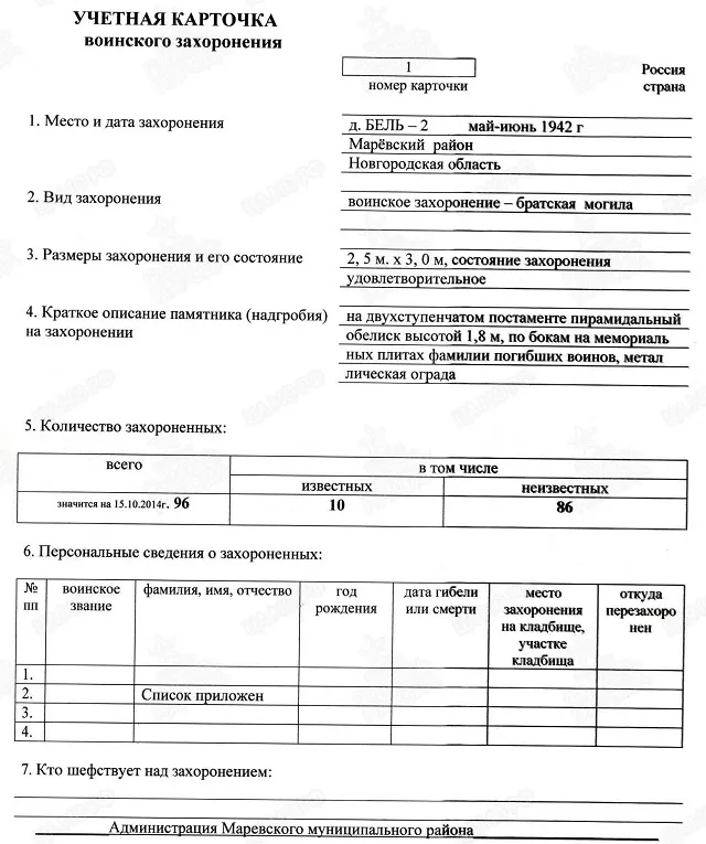 Страна захоронения Россия Регион захоронения Новгородская обл. Номер захоронения в ВМЦ 53-494/2014 Место захоронения Маревский р-н, д. Бель-2 Дата создания современного места захоронения __.05.1942 Дата последнего захоронения __.06.1942 Вид захоронения братская могила Состояние захоронения удовлетворительное Количество могил 1 Захоронено всего 96 Захоронено известных 10 Захоронено неизвестных 86 Кто шефствует над захоронением Администрация Маревского муниципального р-на https://obd-memorial.ru/html/info.htm?id=89581943&p=3