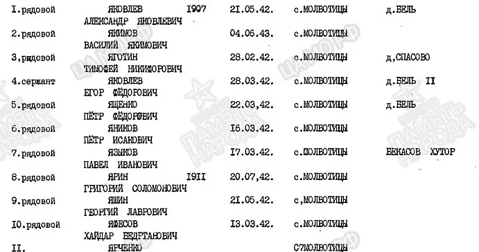 № 53 Фамилия Енупенков Имя Владимир Отчество Яковлевич Дата рождения/Возраст __.__.1922 Воинское звание сержант Дата смерти 28.03.1942 Страна захоронения Россия Регион захоронения Новгородская обл. Место захоронения Демянский р-н, д. Тарасово https://obd-memorial.ru/html/info.htm?id=1154188030