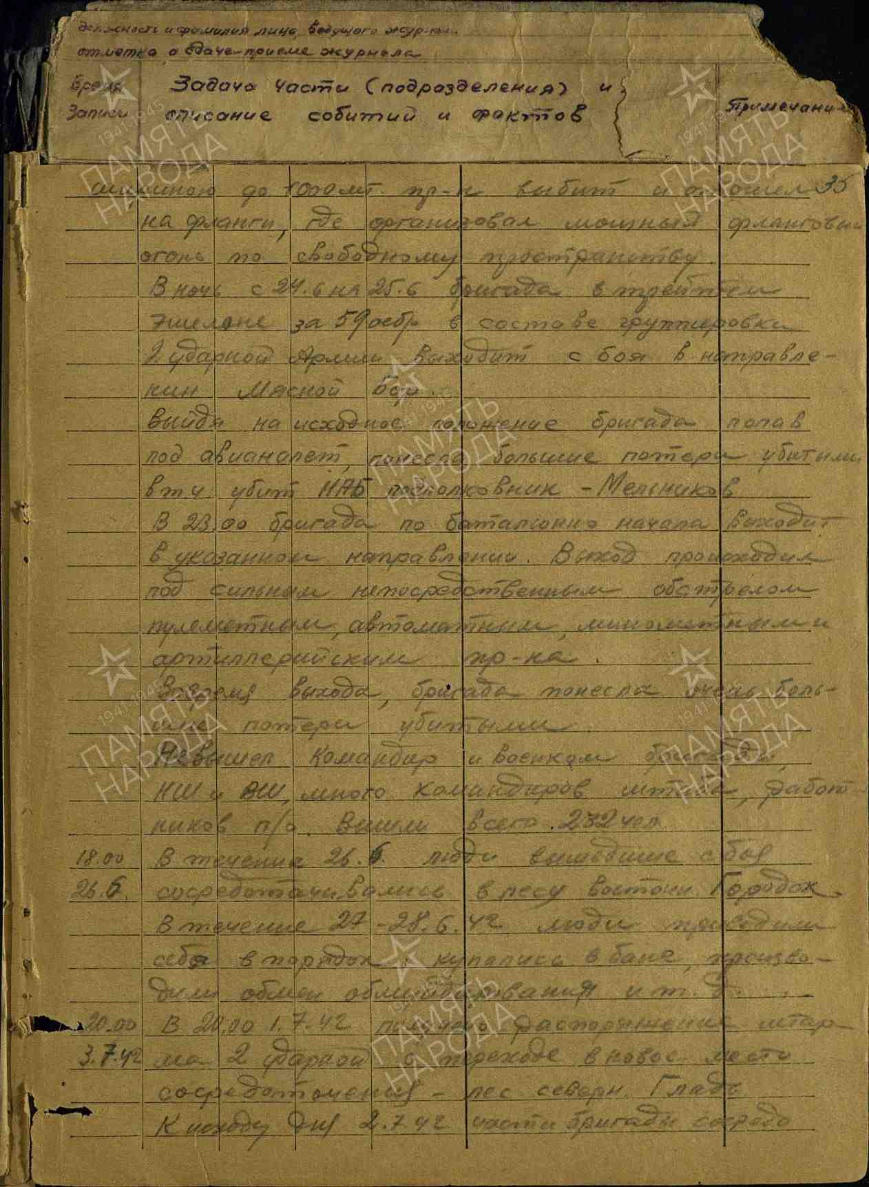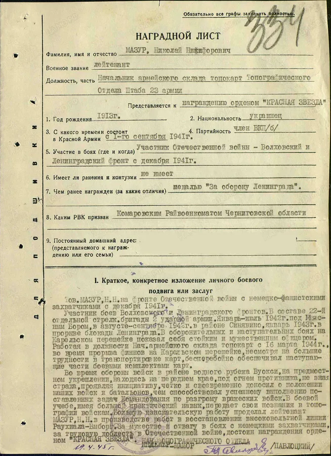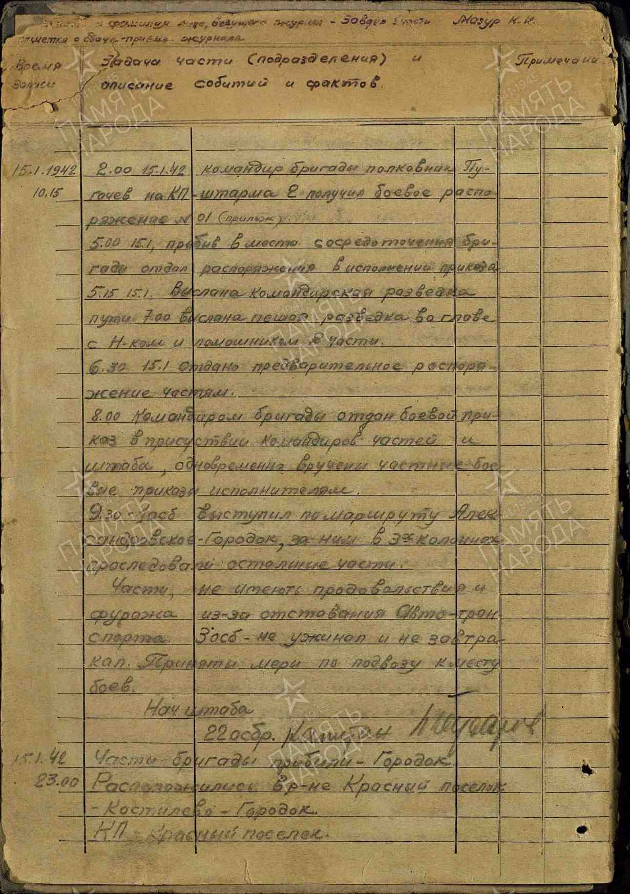 НАПРЯМУЮ к истории моей семьи Мясной бор не имеет отношения. Но ЖБД штаба 22 осбр я перечитала несколько раз. Уникальный документ. Документ ИЗНУТРИ котла, сдержанный, но до мурашек по коже. Меня взволновала судьба человека, который вёл этот журнал (ЖБД): Мазур Николай Никифорович (1913 г. р.), в ту пору техник-интендант 1-го ранга. Тогда он выжил, вышел при прорыве (возможно, сам и вынес ЖБД?), воевал дальше, получил Орден Красной Звезды (1945 г, есть описание подвига). Судя по всему, Мазур Н. Н. пережил войну и был жив в 1985 г., раз есть награждение юбилейным Орденом Отечественной войны II степени. Всё это информация с сайта "Память народа". На сайте "Дорога Памяти" его нет.