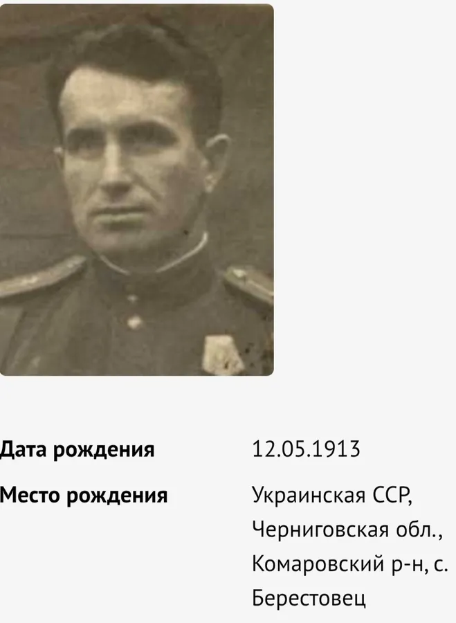 Мазур Николай Никифорович, 1913 г. рождения. Украинец. Место рождения: Украина, Черниговская обл., Комаровский р-он, станция Берестовец. В документах на сайте "Память Народа" указывается, что у него была жена Мазур Татьяна и четверо детей.