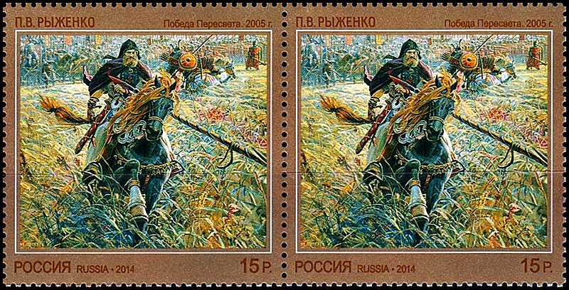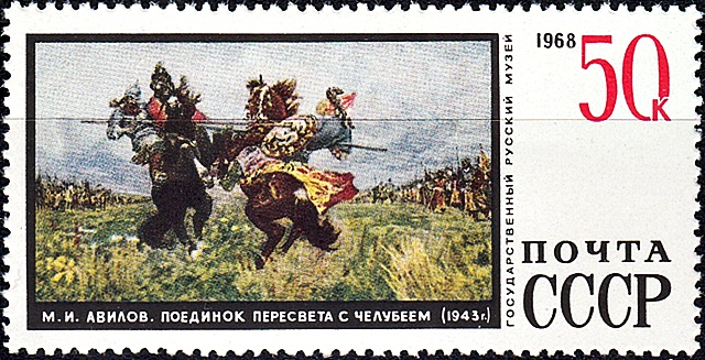 Согласно канонической версии хода сражения, битва у впадения реки Непрядва в Дон (это территория современной Тульской области) началась с поединка татарского богатыря ЧЕЛУБЕЯ и инока Троице–Сергиева монастыря Александра ПЕРЕСВЕТА. Оба пали замертво. Смяв передовой полк, татары стали теснить русские дружины в центре и на левом фланге. Их напору не поддавался только правый фланг под командованием князя АНДРЕЯ — старшего сына великого литовского князя ОЛЬГЕРДА.