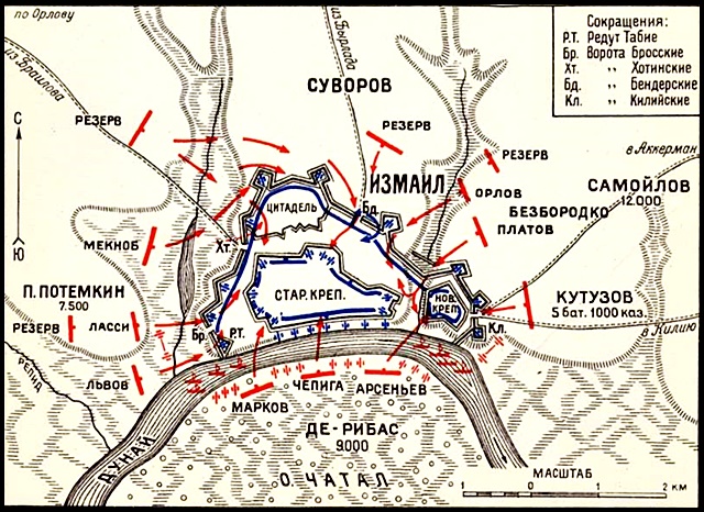 Особое значение в ходе русско-турецкой войны 1787-1791 годов имело взятие Измаила - цитадели турецкого владычества на Дунае. Измаильская крепость лежала на левом берегу Килийского рукава Дуная между озерами Ялпухом и Катлабухом, на склоне отлогой высоты, оканчивающейся у русла Дуная низким, но довольно крутым скатом.