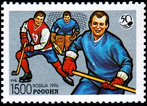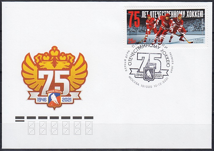 Почтовая марка, посвящённая 75-летию отечественного хоккея. на почтовой марке изображены выдающиеся хоккеисты Анатолий Фирсов, Валерий Харламов и Валерий Васильев)