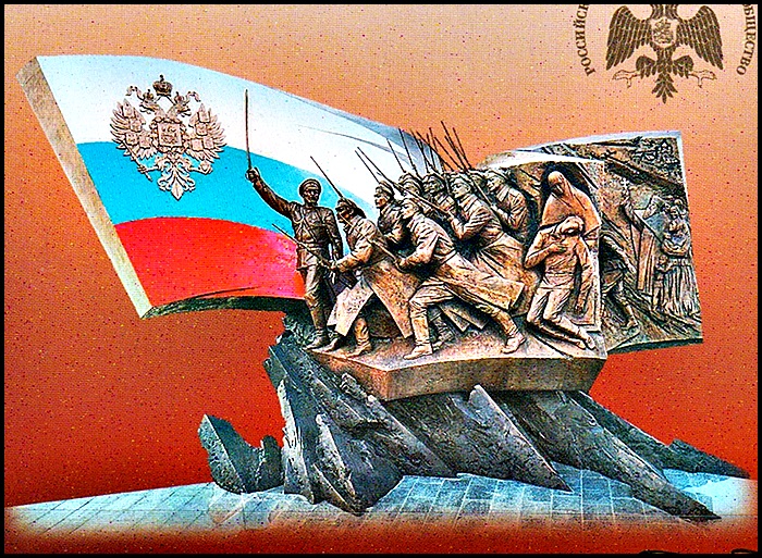 Памятник героям Первой мировой войны — многофигурная композиция: на фоне флага России офицер поднимает солдат в атаку. Рядом сестра милосердия спасает раненого. В группе солдат казак Козьма Крючков — первый награждённым Георгиевским крестом в Первую мировую войну. В образе сестры милосердия можно узнать великую княгиню Елизавету Фёдоровну