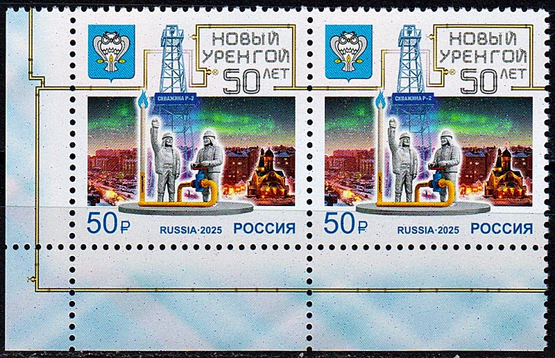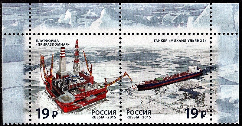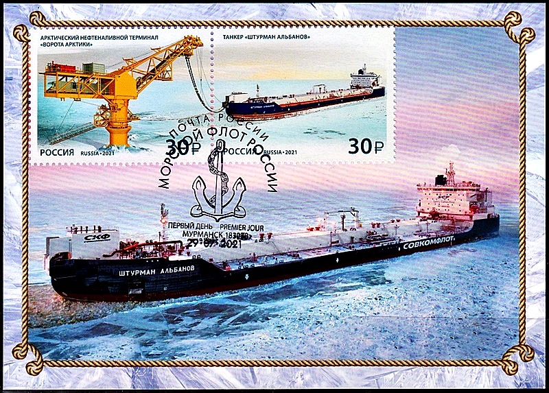 На почтовых марках изображены арктический нефтеналивной терминал «Ворота Арктики» и танкер «Штурман Альбанов».