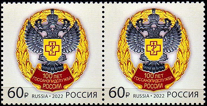 На почтовой марке изображена эмблема Федеральной службы по надзору в сфере защиты прав потребителей и благополучия человека.
