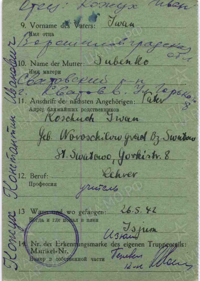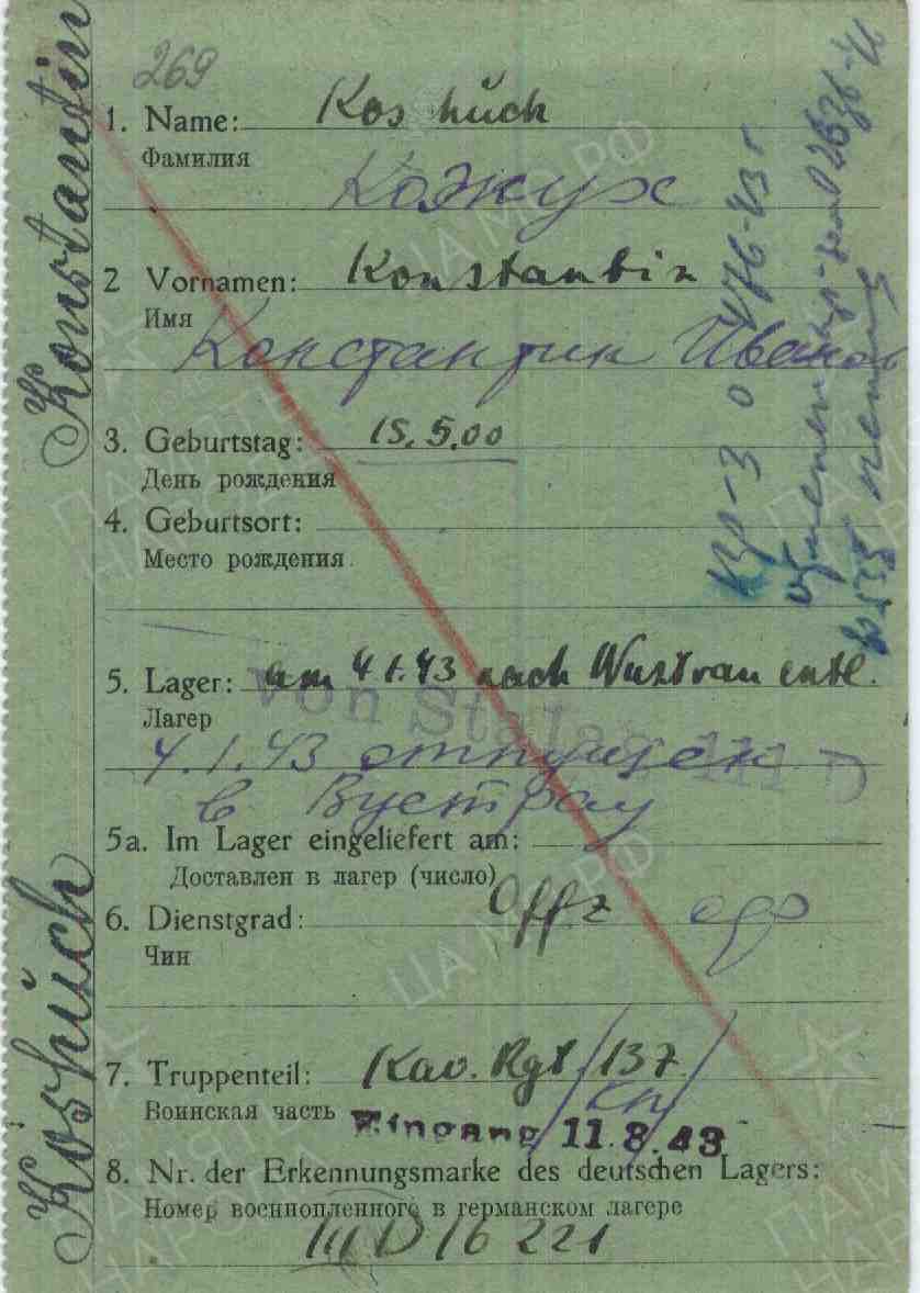 Фамилия Кожух Имя Константин Отчество Иванович Дата рождения/Возраст 15.05.1900 Дата пленения 26.05.1942 Место пленения Изюм Лагерь шталаг III D Лагерный номер 16221 Судьба попал в плен Последнее место службы 137 кп Воинское звание мл. офицер