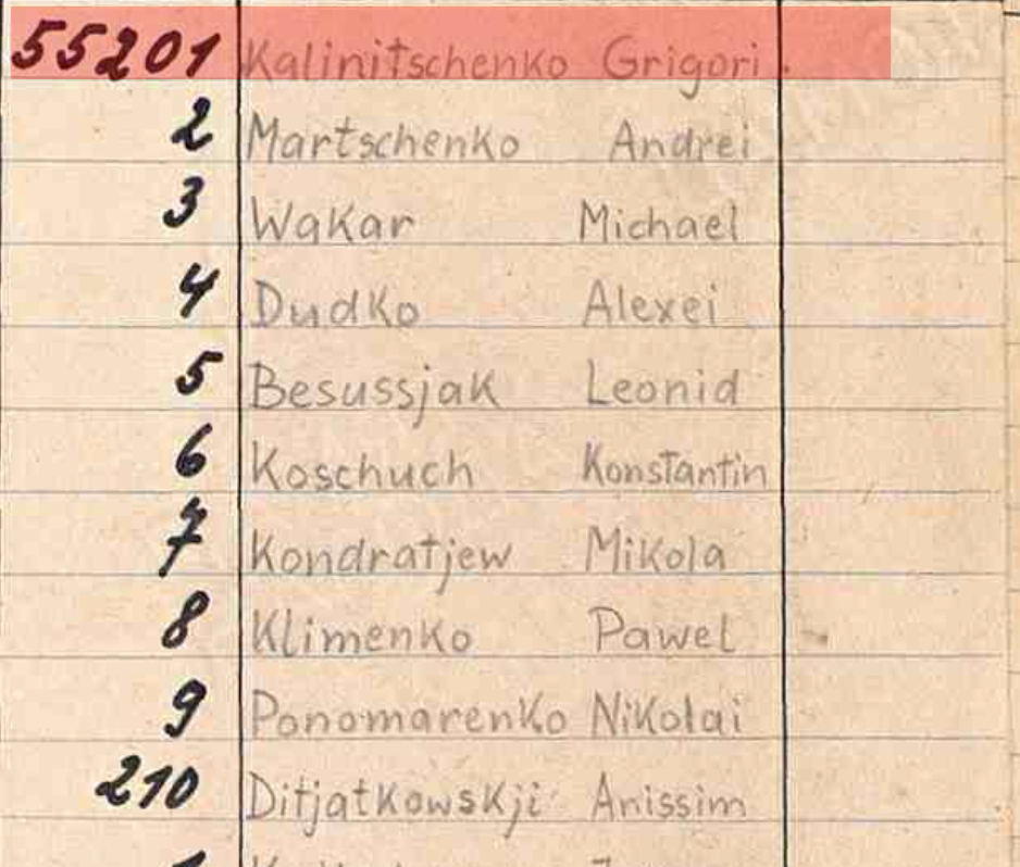 Фамилия Калиниченко Имя Григорий Лагерь конц. лагерь Заксенхаузен Лагерный номер 55201 Судьба попал в плен Название источника донесения РГВА Номер фонда источника информации 1367