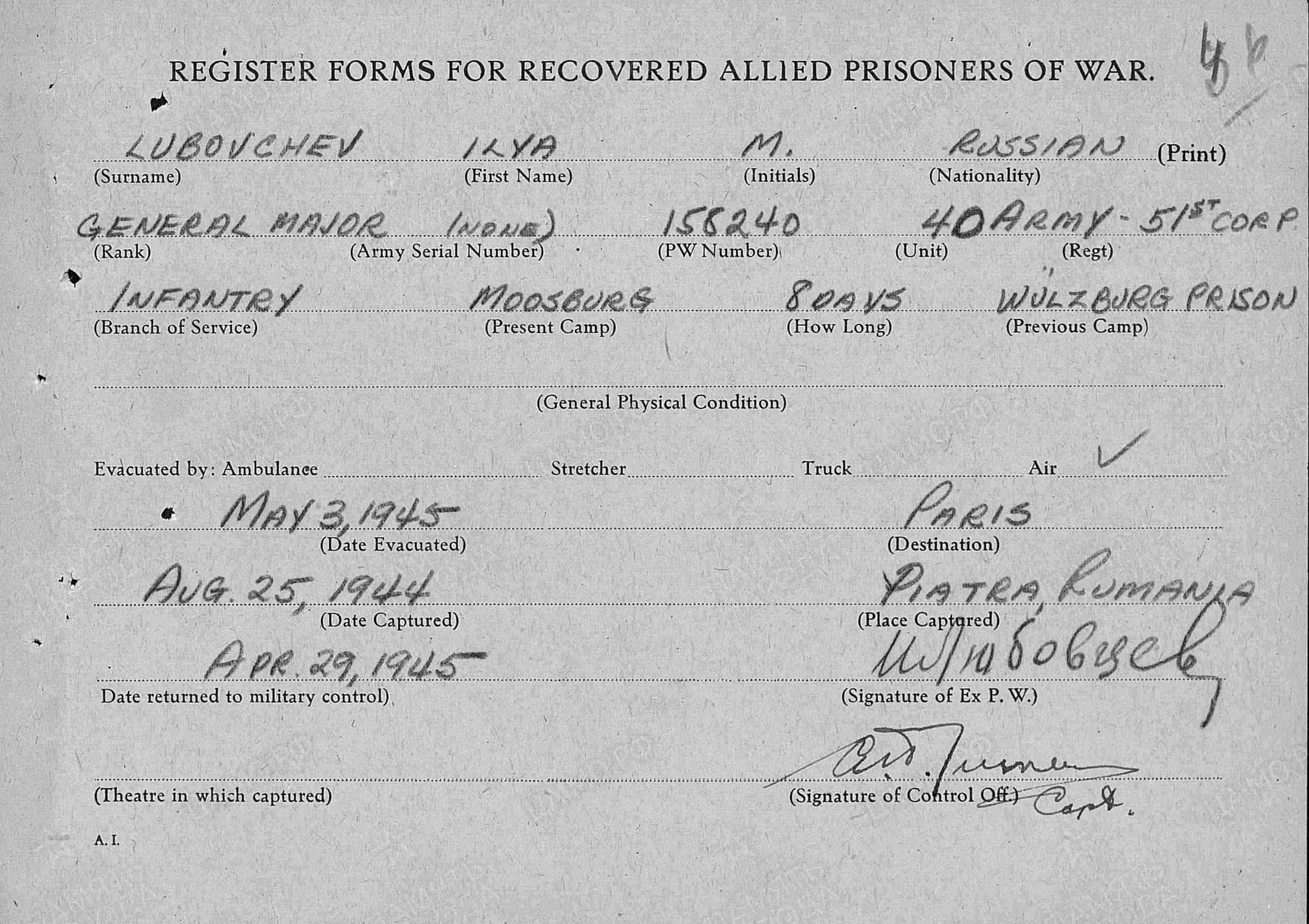 Он содержался потом в Вюльцбурге (Илаг 13) с Лукиным и пр. и освобожден был с ними вместе. Американские анкеты на всех с указанием Вюльцбург.