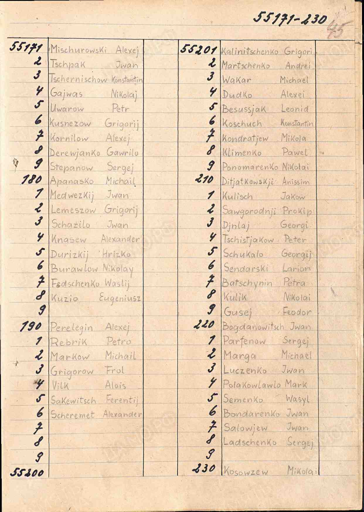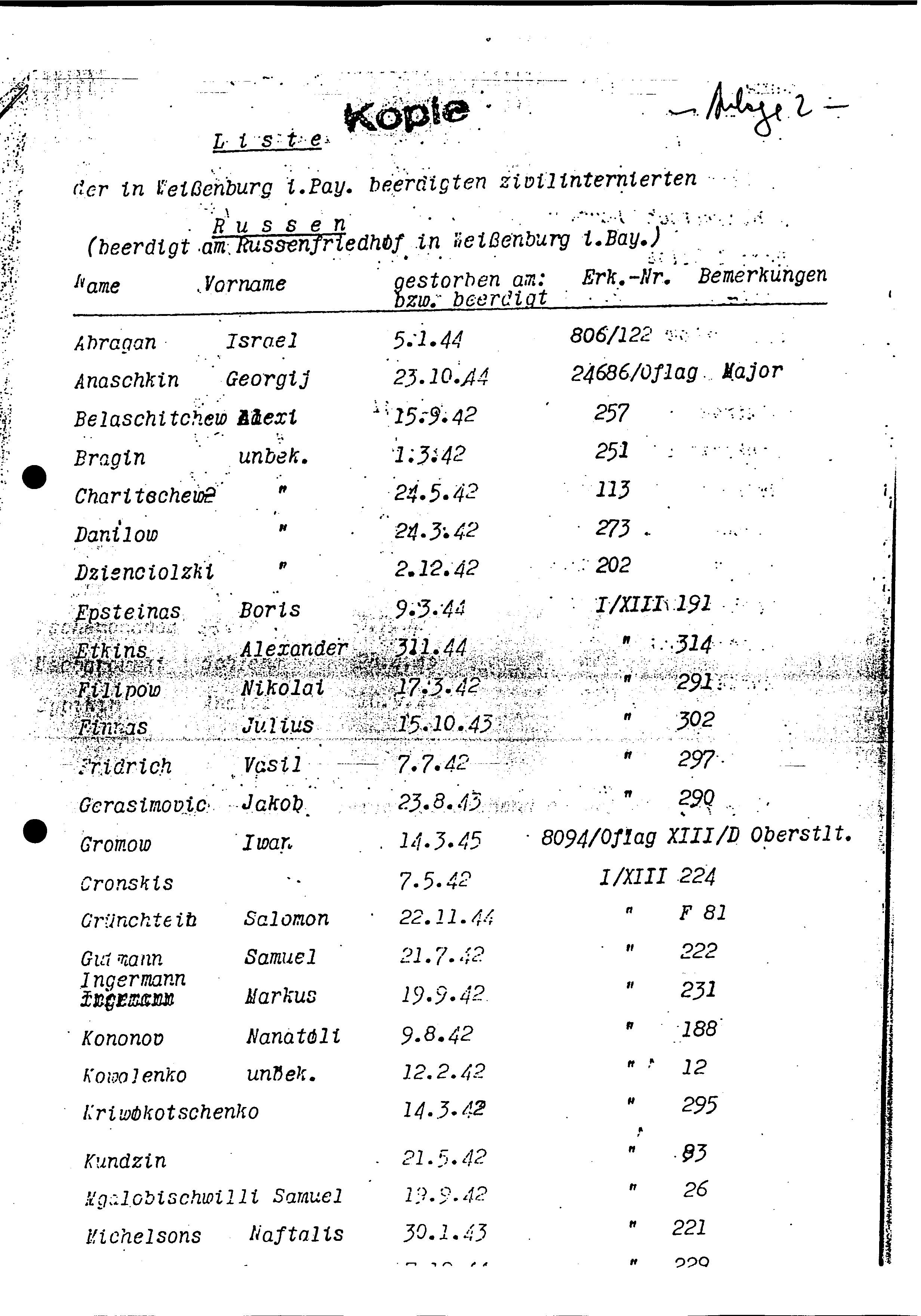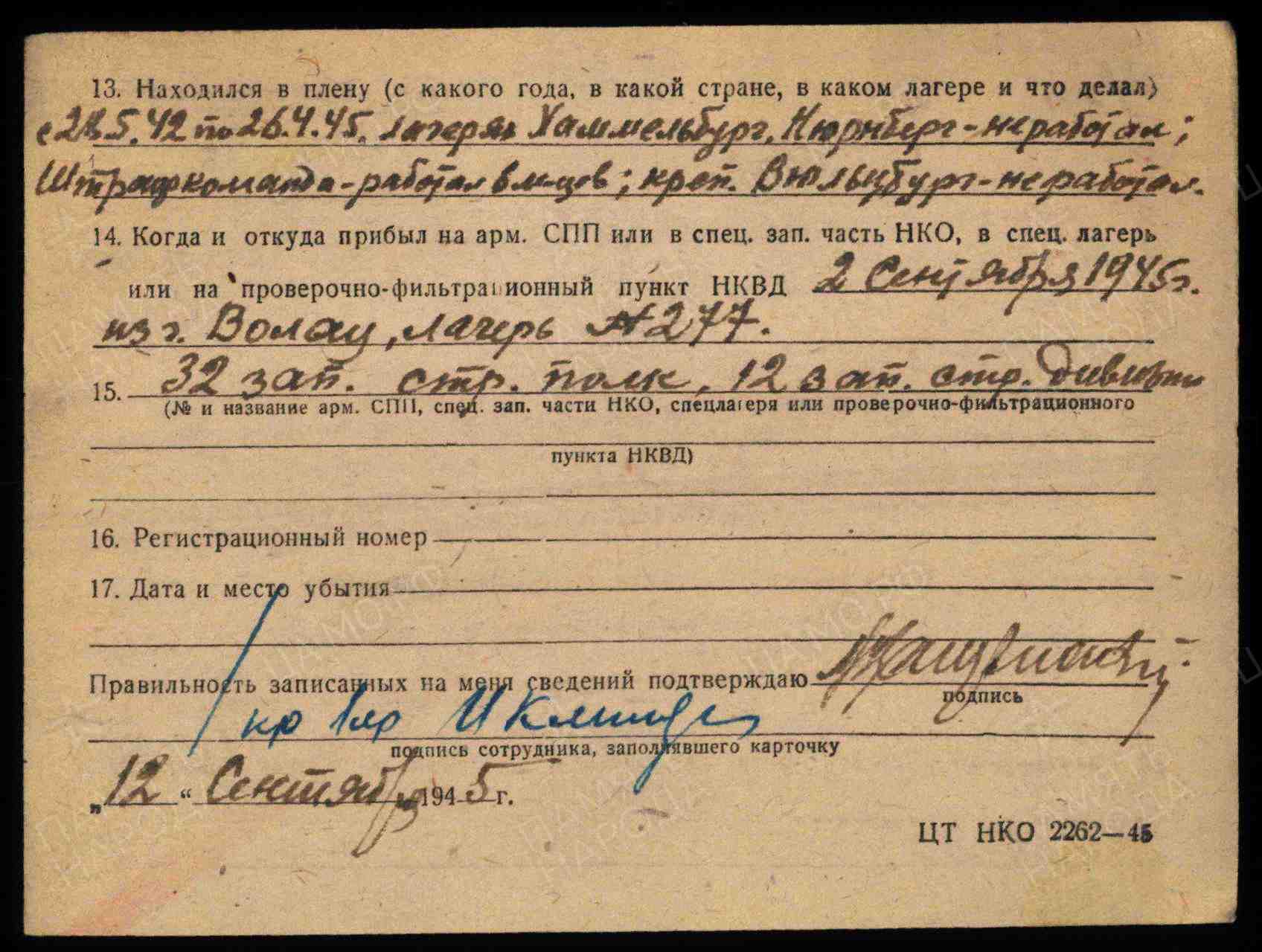 | Двое военнопленных , которые умерли в Илаг 13. Больше там не умирали в/п. Только на них есть ПК с записями об Илаге 13. Все остальные были освобождены американцами. Несколько (по воспоминаниям) во время марша, за сутки до освобождения, наелись брюквы и умерли. Этих уже никто не учитывал, но их документы, думаю, тоже были переданы американцам.