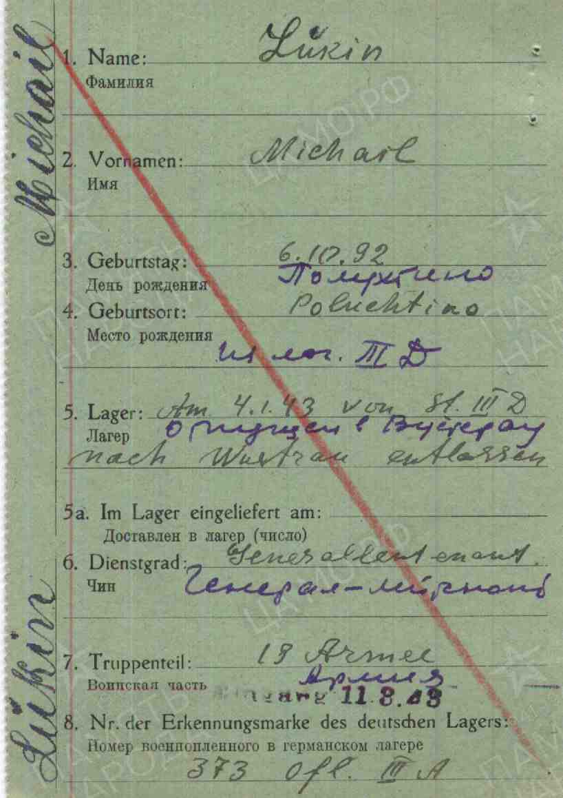 Написали, что отпустили и ЗК на Лукина есть с таким оборотом от 04.01.1943. Но оба отказались работать на немцев в Вустрау. И они оба потом с 1943 года (дату не знаю) до освобождения в 1945 сидели в крепости Вюльцбург Илаг XIII, а это лагерь для интернированных. Но явно они не были в статусе интернированных, так там сидело много генералов и старших офицеров.