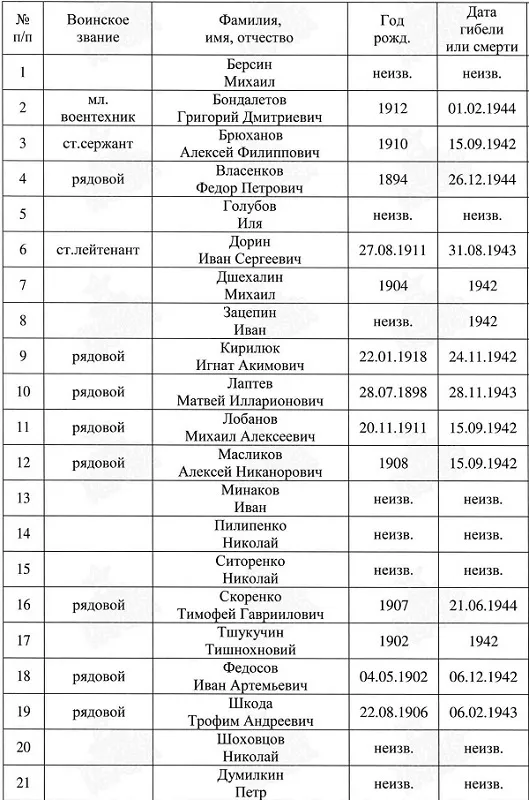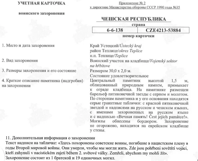 Список Советских военнопленных захороненных в 1942 году на старом еврейском кладбище в городе Теплице Чешской республики 1. Михаил Лобанов 2. Алексей Масликов 3. Алексей Бришанов 4. Игнат Кирилюк 5. Иван Федосон 6. Тшукусцин Тишноховы 7. Микаел Дшехалидзе 8. Трофим Шкода 9. Николай Пилипенко 10. Михаил Берсин 11. Иван Дорин 12. Николай Минаков 13. Иван Зацепин 14. Юлий Голубов 15. Матей Лаптен 16. Николай Ситоренко 17. Грегор Бондалетон 18. Пётр Шумилкин 19. Николай Шохоцов 20. Тимофей Скоренко 21. Пётр Влассенов тема на форуме здесь: http://www.sgvavia.ru/forum/773-2898-1#661516 https://prague-express.cz/society....j-armii Николай Викторович 14 ОА ПВО 1974-1976 У России только два союзника - это Армия и Флот