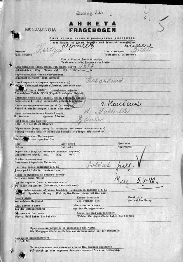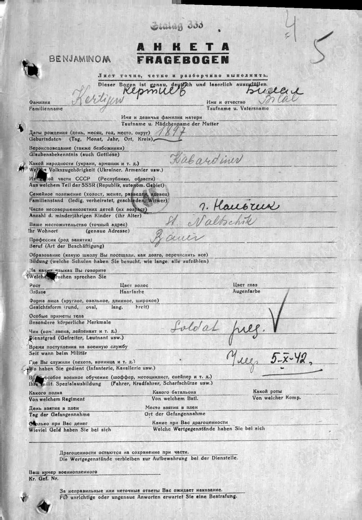 Эти анкеты лежали в отделе карт администрации шталага 333. Регистрация пленных (статус пленных) и оформление перскарт - не тождественные понятия, имхо. Ольга, Новокузнецк Молчат гробницы, мумии и кости, - Лишь слову жизнь дана: Из древней тьмы, на мировом погосте Звучат лишь письмена (И. Бунин)