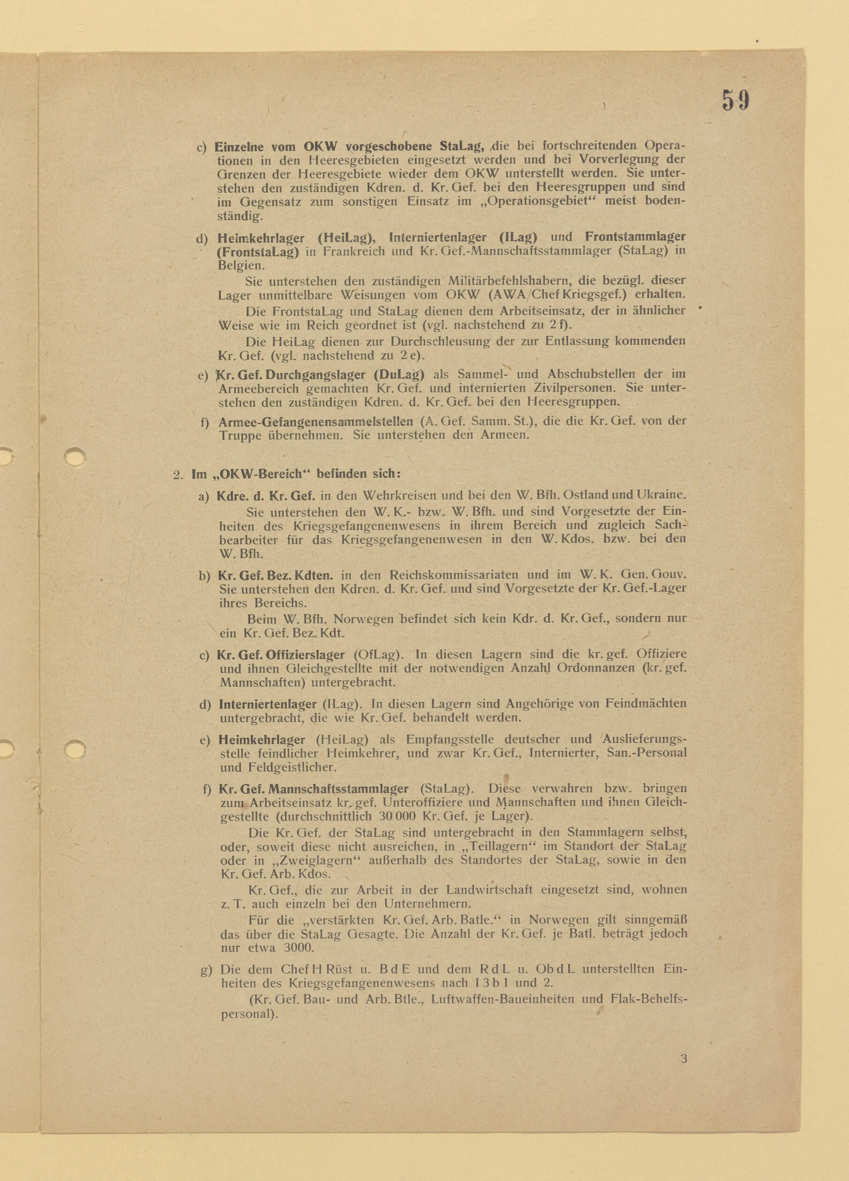 Содержит: материалы, предоставленные командующим военнопленными командующему вермахтом в Украине для ежемесячных отчетов; льготный режим для некоторых военнопленных с указанием лагерей ; обеспечение военнопленными; порядок освобождения военнопленных; внешний список рассылки от 3 июля 1942 года; инструкция «Экономическая организация Востока» ; регистрация тюркских народов; список подразделений, которым разрешен открытый почтовый адрес; организация войск от 1 марта 1943 года ; служебные инструкции для квартирмейстеров вермахта в зонах безопасности командующего вермахтом в Украине; специальный приказ по делам военнопленных в оперативной зоне № 4 ; приказ фюрера по делам военнопленных и соответствующие положения ОКВ; приказы об обращении с захваченными «партизанами».