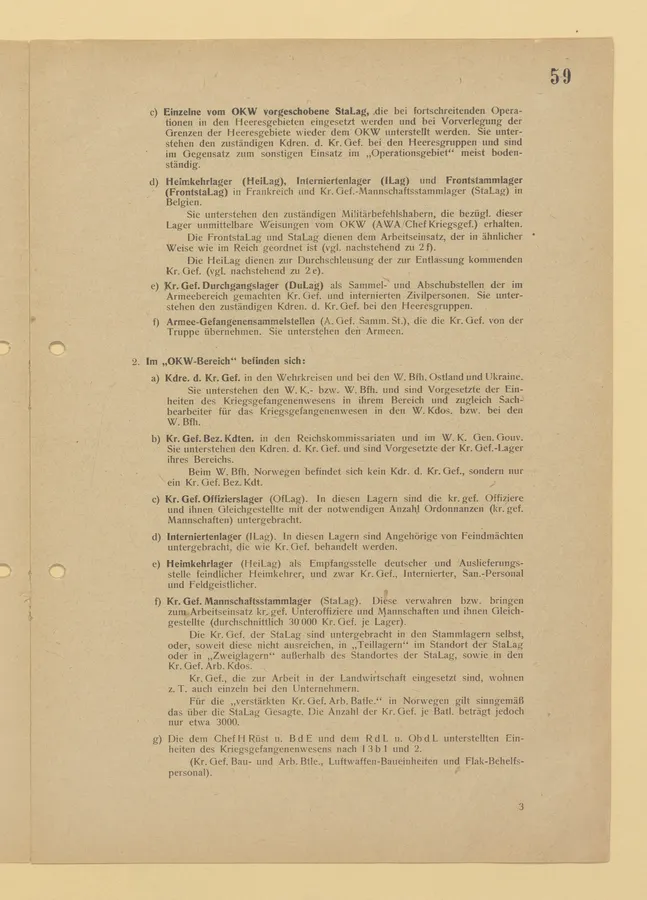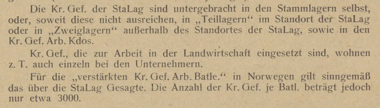 Шталаг Кр. Геф. размещаются в самих основных лагерях или, если их недостаточно, в «частичных лагерях» на территории Шталага или в «филиалах» за пределами территории Шталага, а также в Кдос Кдос. Кр. Gef., которым поручено работать в сельском хозяйстве, живут, например. Иногда и индивидуально с предпринимателями. Для "усиленного Кр. Геф. Арб. Батле". в Норвегии то, что было сказано о Шталагах, применимо соответствующим образом. Однако количество Кр. Геф. за батл. составляет всего около 3000.