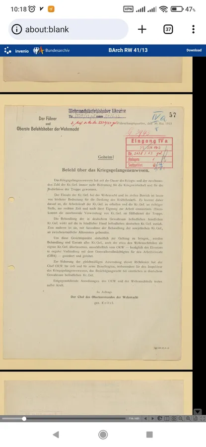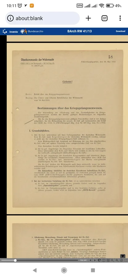 122. Der Führer und Oberste Befehlshaber der Wehrmacht, Befehl über das Kriegsgefangenenwesen, 30 мая 1943 г., BA-MA, RW 41/13.