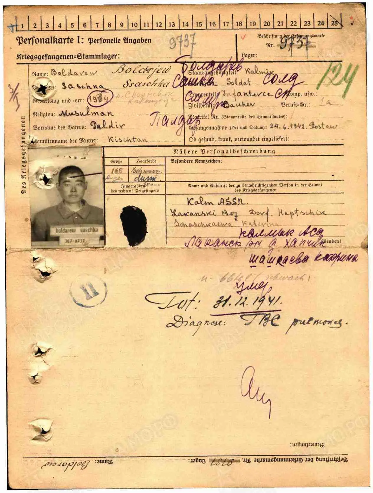 Фамилия Болдырев Имя Александр Отчество Палдирович Дата рождения/Возраст __.__.1904 Место рождения Калмыцкая АССР, Хапчик Дата пленения 24.06.1942 Место пленения Ростов Лагерь шталаг 367 Лагерный номер 9737 Судьба Погиб в плену Воинское звание красноармеец|рядовой Дата смерти 31.12.1943 Первичное место захоронения Вартелагер (Ченстохова) Название источника донесения ЦАМО https://obd-memorial.ru/html/info.htm?id=300901434&p=1