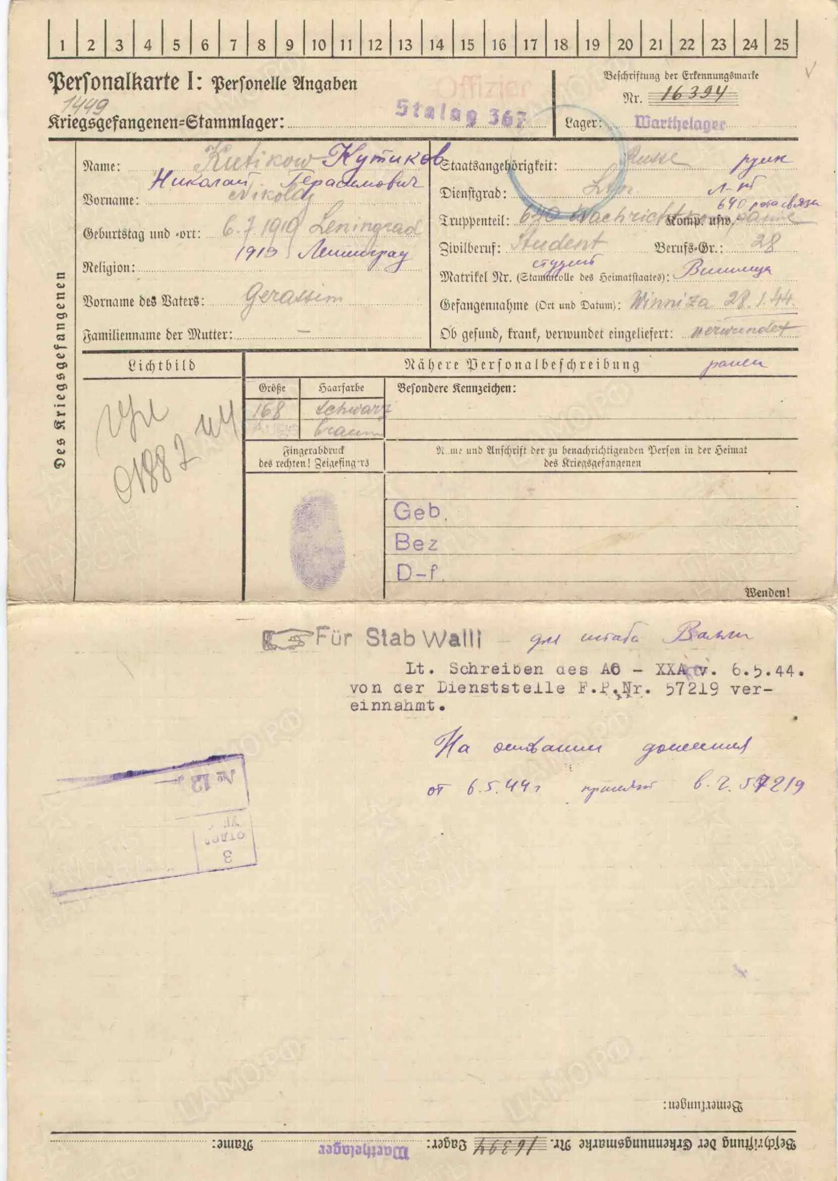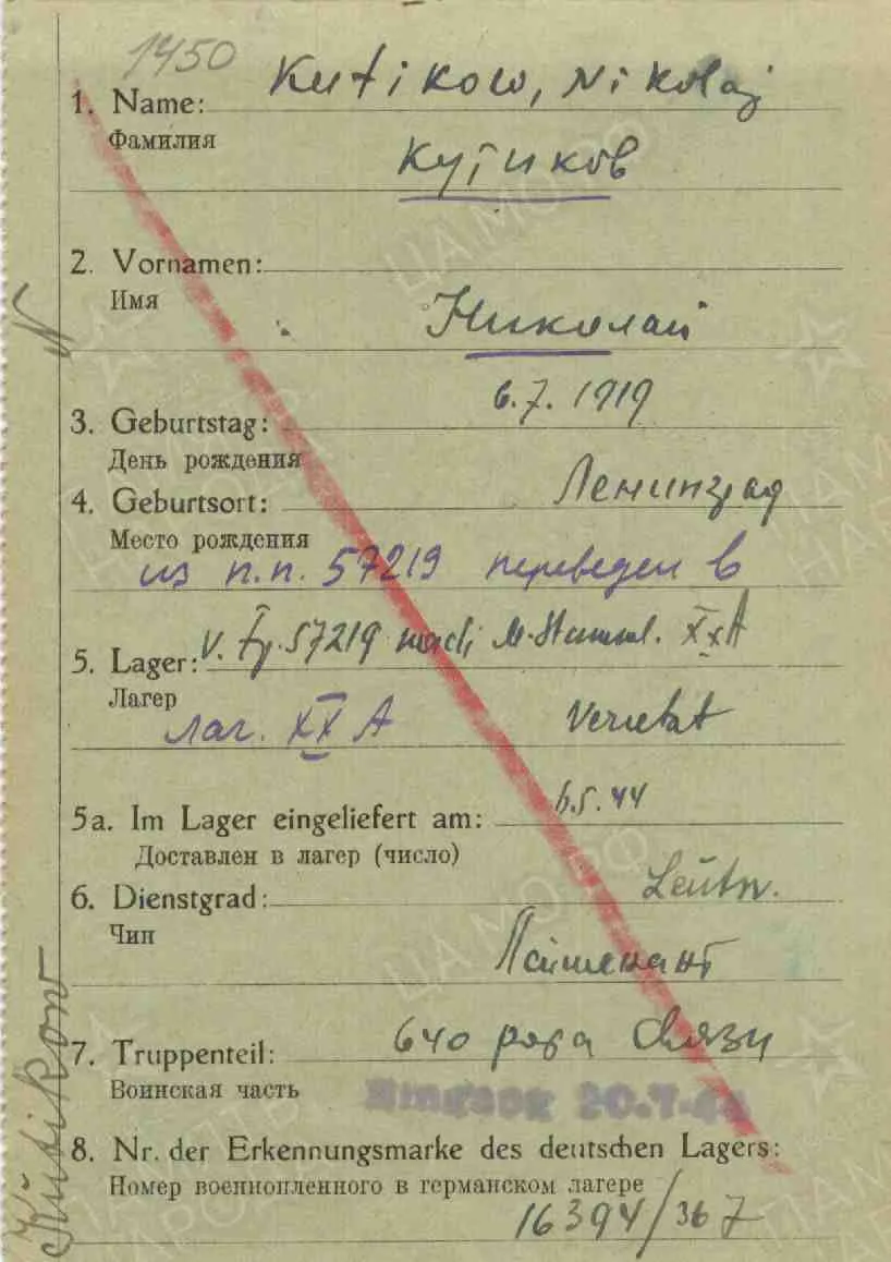 Информация о военнопленном ID 272065794 Фамилия Кутиков Имя Николай Отчество Герасимович Дата рождения/Возраст 06.07.1919 Место рождения Ленинградская обл., г. Ленинград Дата пленения 28.01.1944 Место пленения Винница Лагерь шталаг 367 филиал Warthelager Лагерный номер 16394 Судьба передан гестапо/СД Последнее место службы 640 рота связи Воинское звание лейтенант Название источника донесения ЦАМО Номер фонда источника информации Картотека военнопленных офицеров https://obd-memorial.ru/html/info.htm?id=272065794&p=1