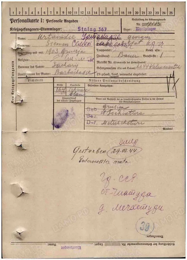 Информация о военнопленном ID 300614235 Фамилия Уртанидзе Имя Семен Отчество Захарович Дата рождения/Возраст __.__.1903 Место рождения Грузинская ССР Дата пленения __.__.1944 Место пленения Калинковичи Лагерь шталаг 367 Лагерный номер 17285 Судьба Погиб в плену Воинское звание красноармеец|рядовой Дата смерти 29.03.1944 Первичное место захоронения Вартелагер (Ченстохова) Название источника донесения ЦАМО https://obd-memorial.ru/html/info.htm?id=300614235 Диагноз энтероколит