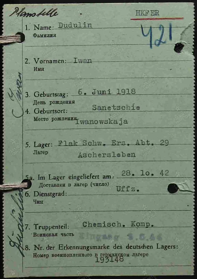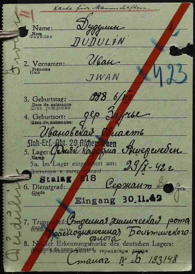 Из других карт Дудулина мы понимаем, что после этого он был переведён в международный шталаг IV B Мюльберг, где ему сменили номер пленного. Он получил новый номер - 193148/IV B. Далее по плену он идëт с этим номером.