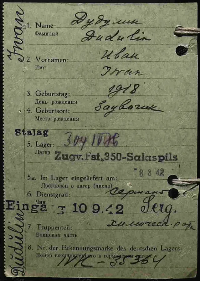 | 8.08.1942 Дудулин прибыл из шталага (фронтшталага, это то же самое) 350 (из его отделения в Саласпилсе, а не в Риге) в шталаг 304 (IV H) Цайтхайн. Где был зарегистрирован под номером 35364. Пока затрудняюсь ответить, был ли это номер от шталага 304, или шталаг 304 принял номер пленного от шталага 350 (бывало и так, и так).