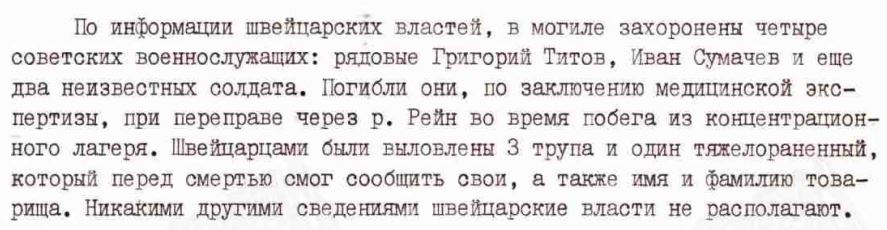 № 2 Фамилия Сумачев Имя Иван Дата смерти __.__.1942 Страна захоронения Швейцария Место захоронения г. Базель, кладбище "Хернли" Могила центральная аллея кладбища "Хернли" https://obd-memorial.ru/html/info.htm?id=262065341